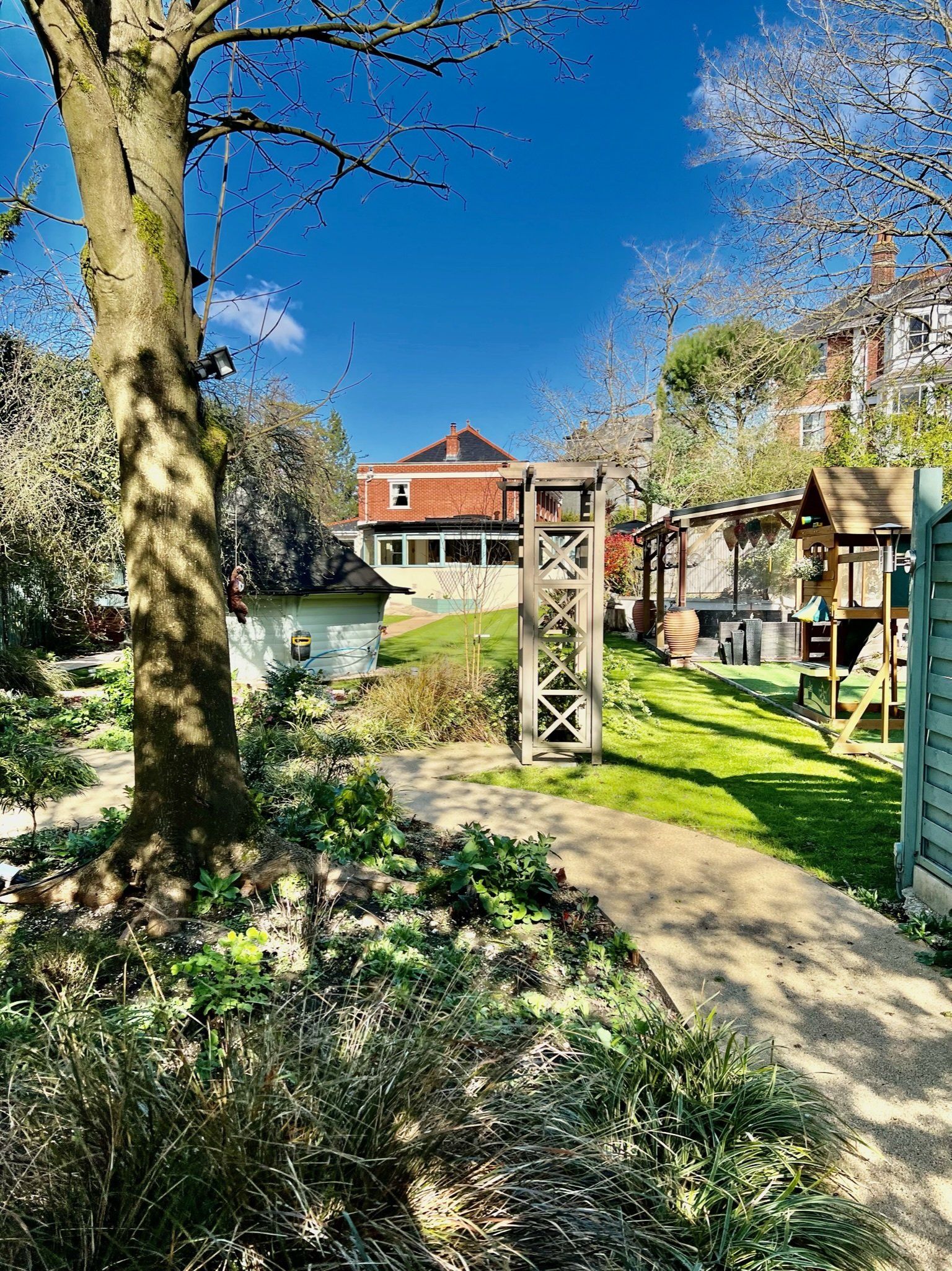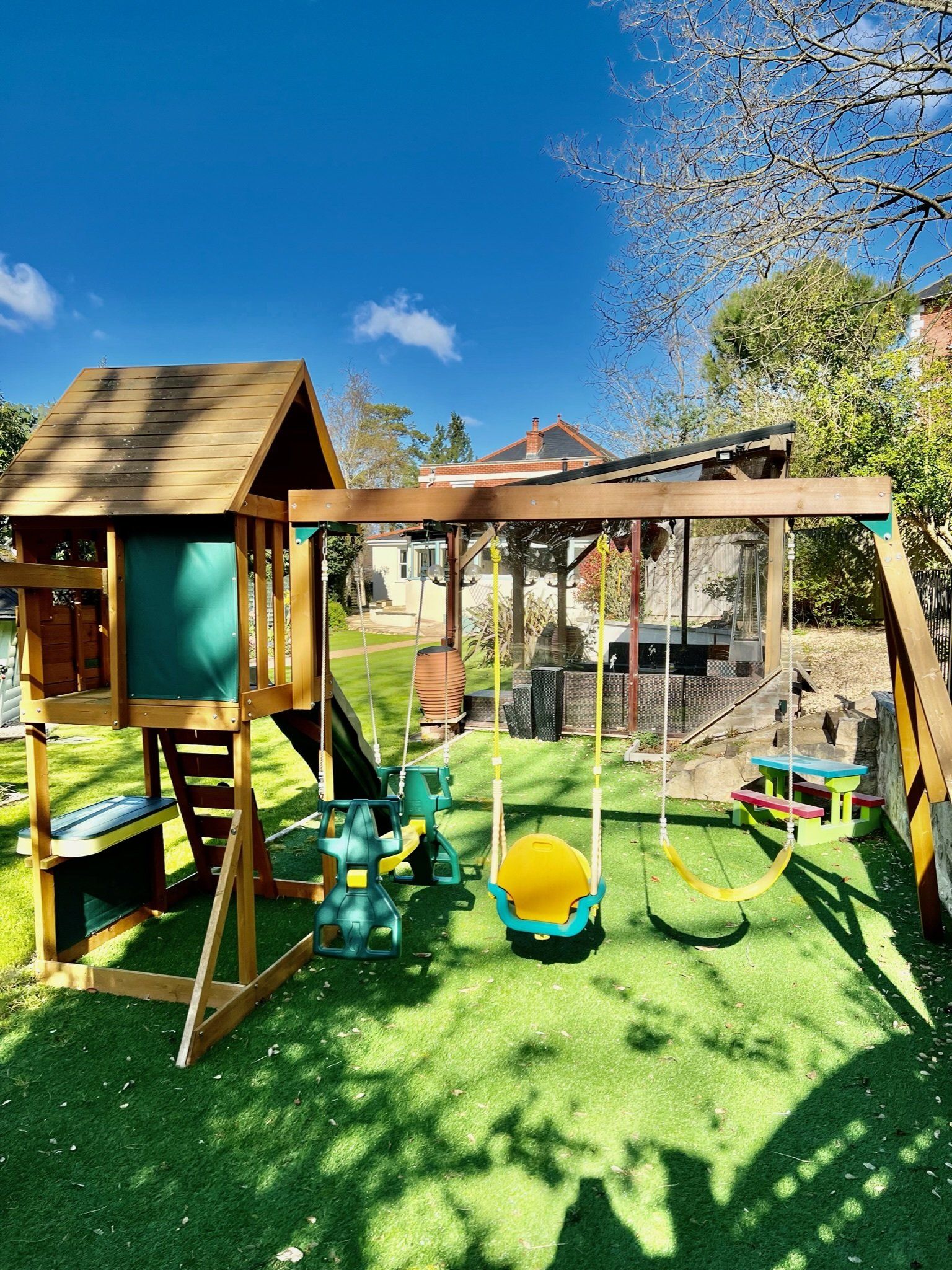 Extensive garden with seating area, barbecue Lodge, childrens play frame, trampoline and hot tub