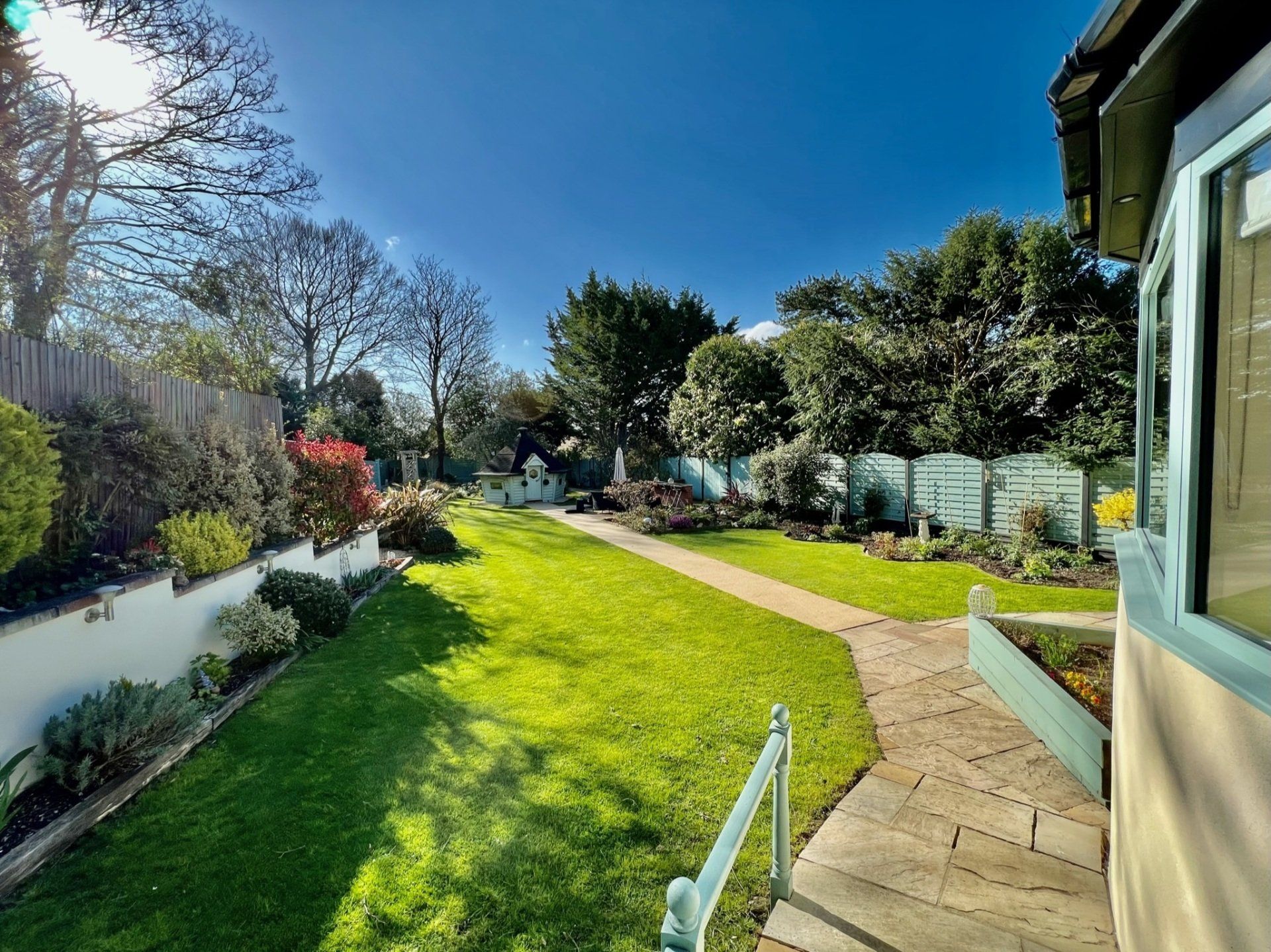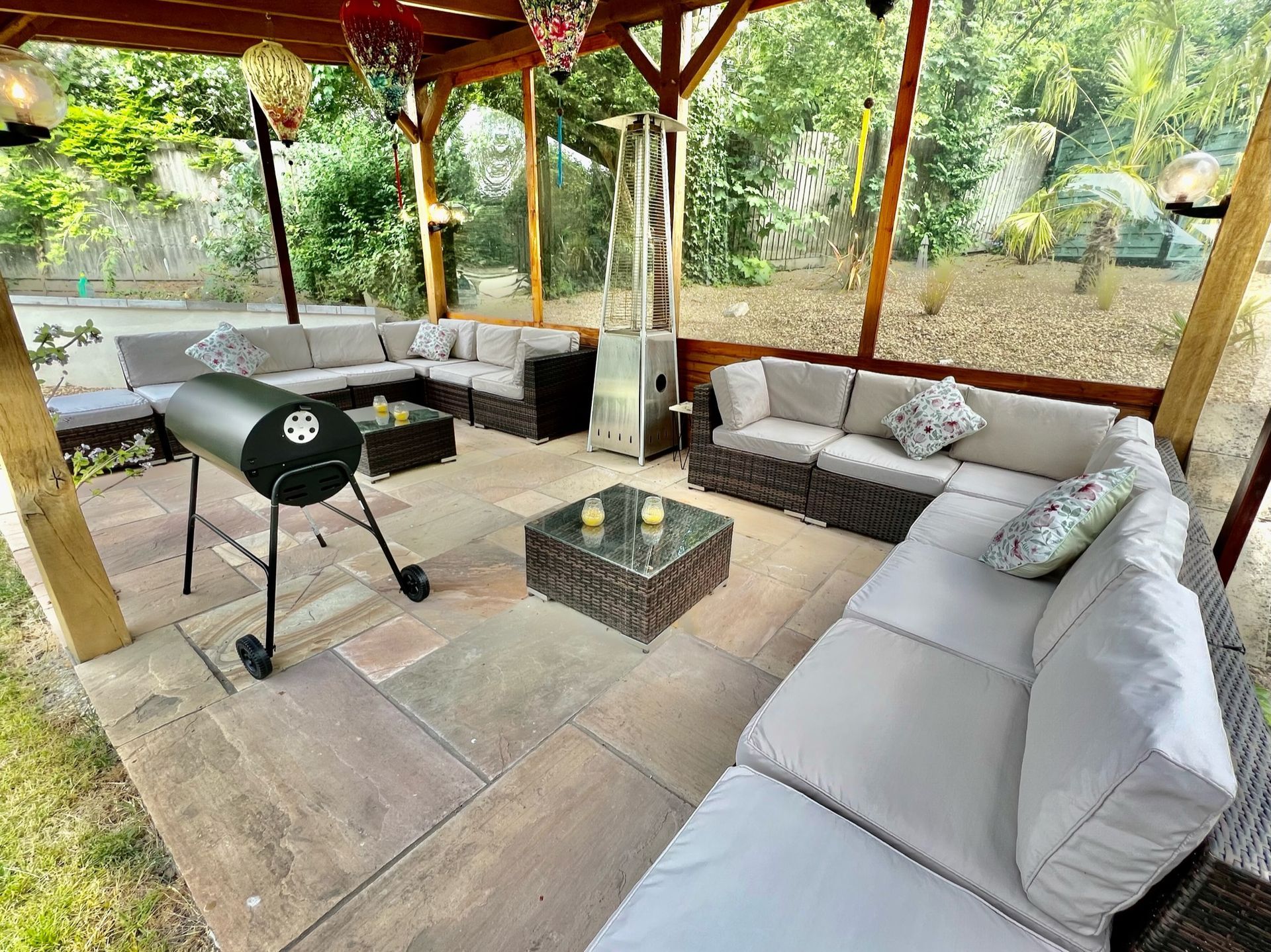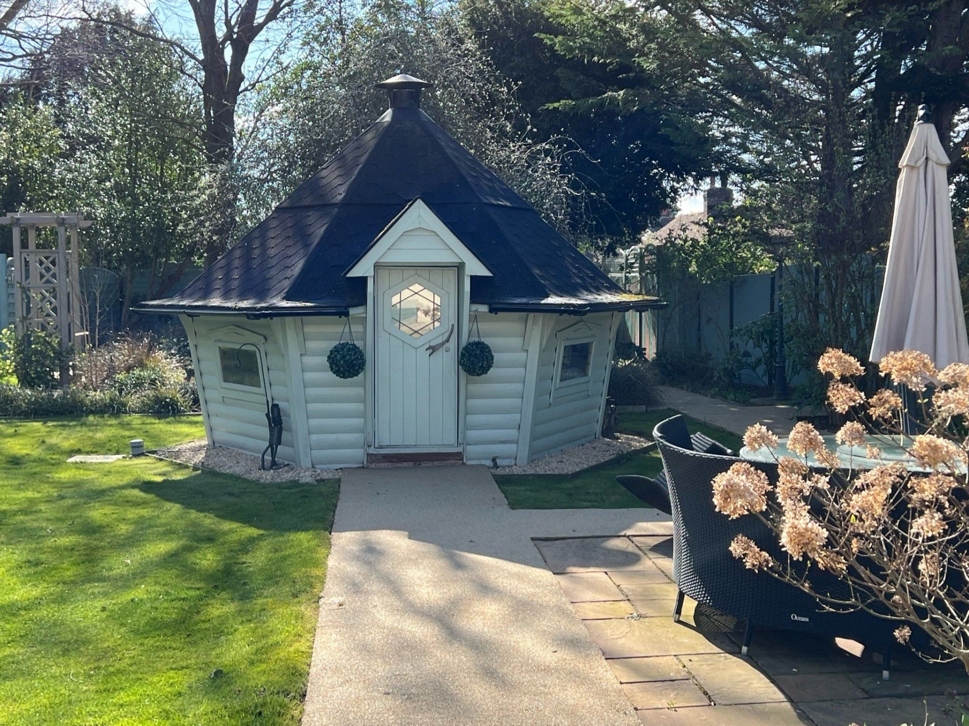 There are lovely gardens, with a children’s play frame and trampoline, hot tub and secure patio area to the rear. A quirky barbecue lodge (Hobbit House) and secure parking for 6 cars behind electric gates