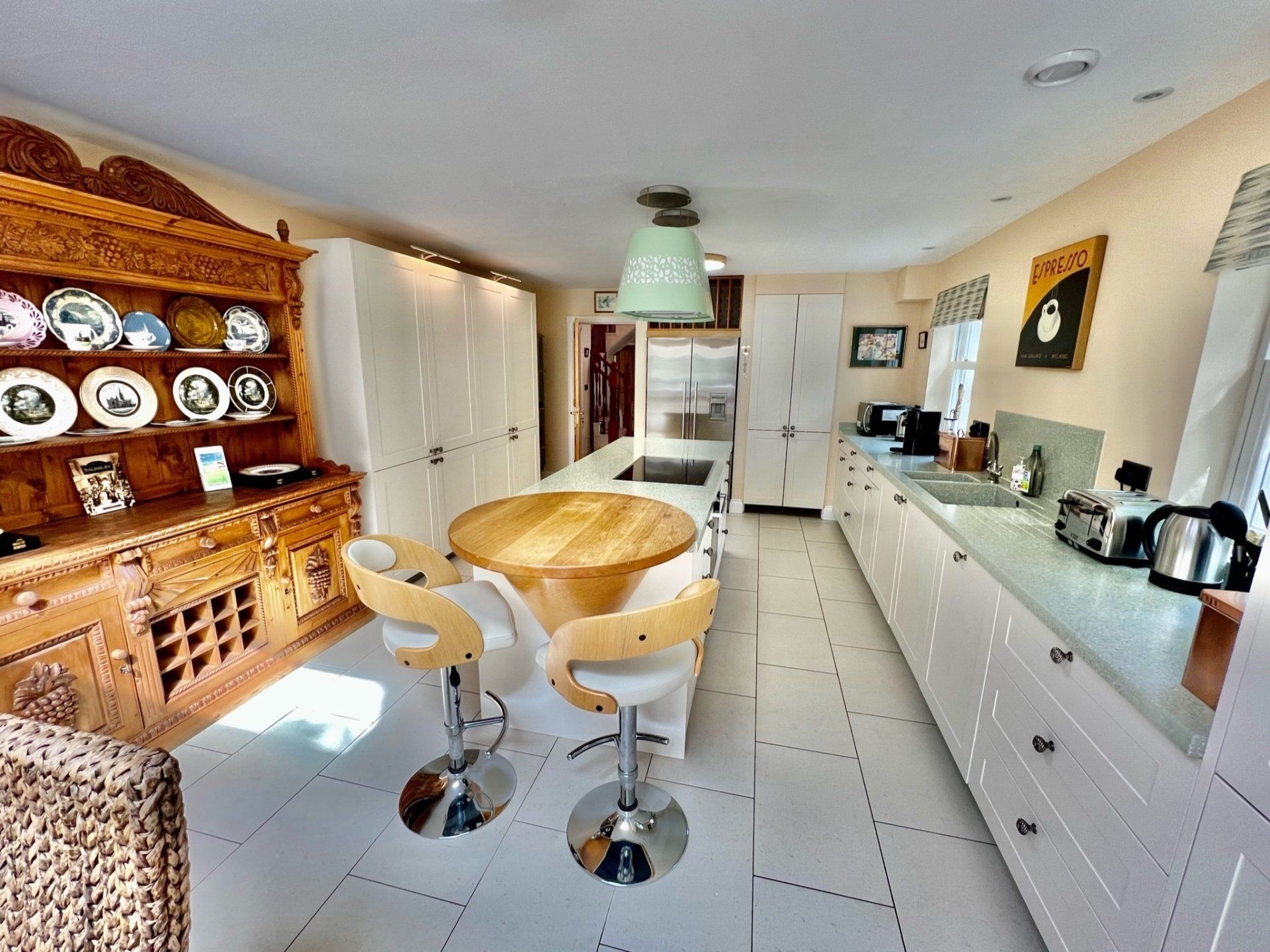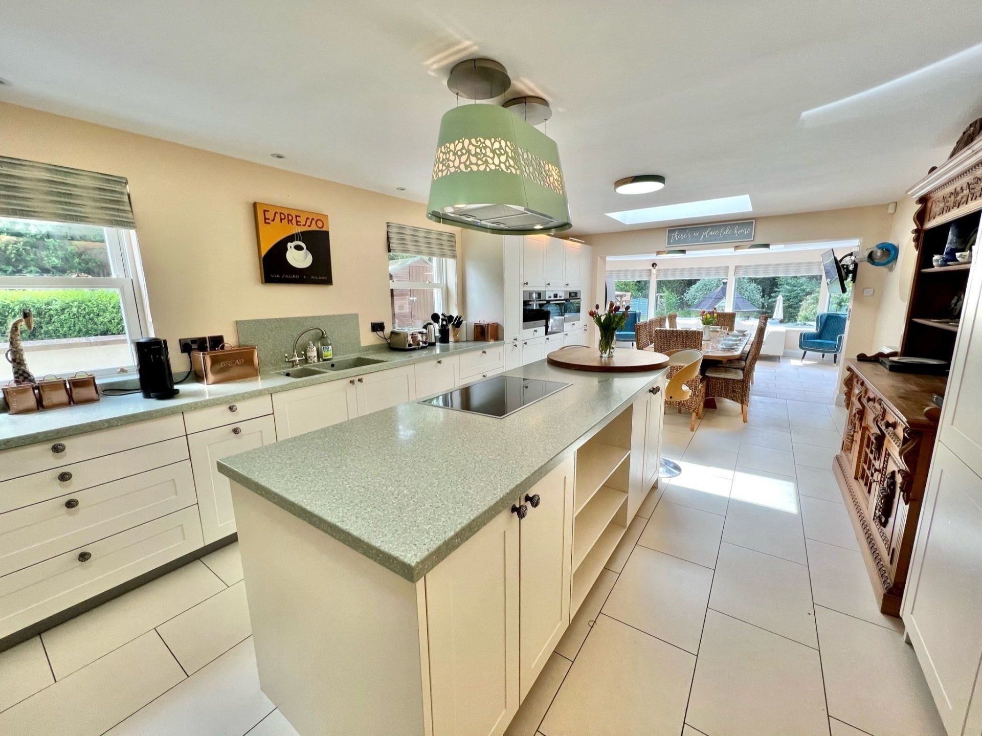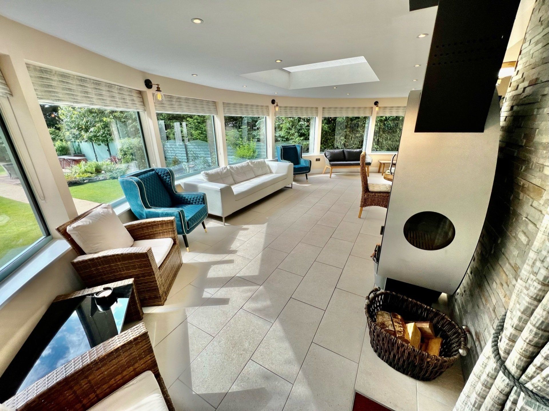 This contemporary home has a spacious bright, airy kitchen and dining area with sun room and wood stove as well as a more formal dining room and a formal drawing room with feature fireplace