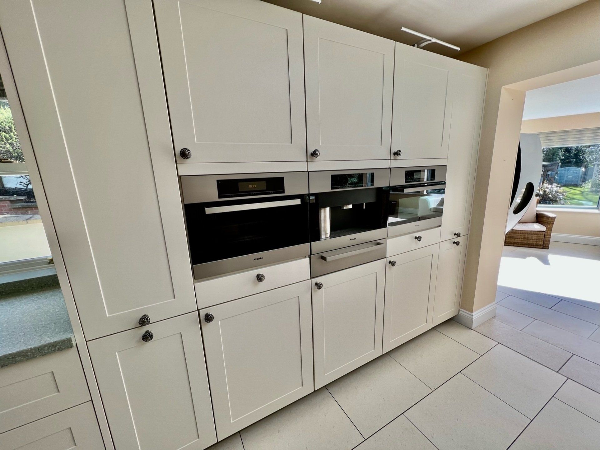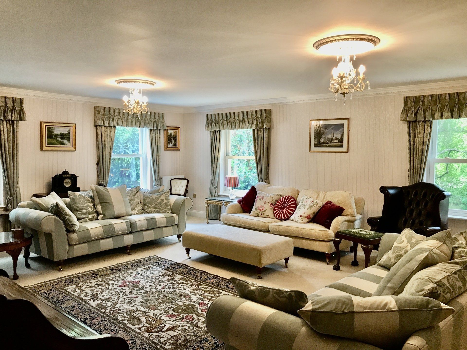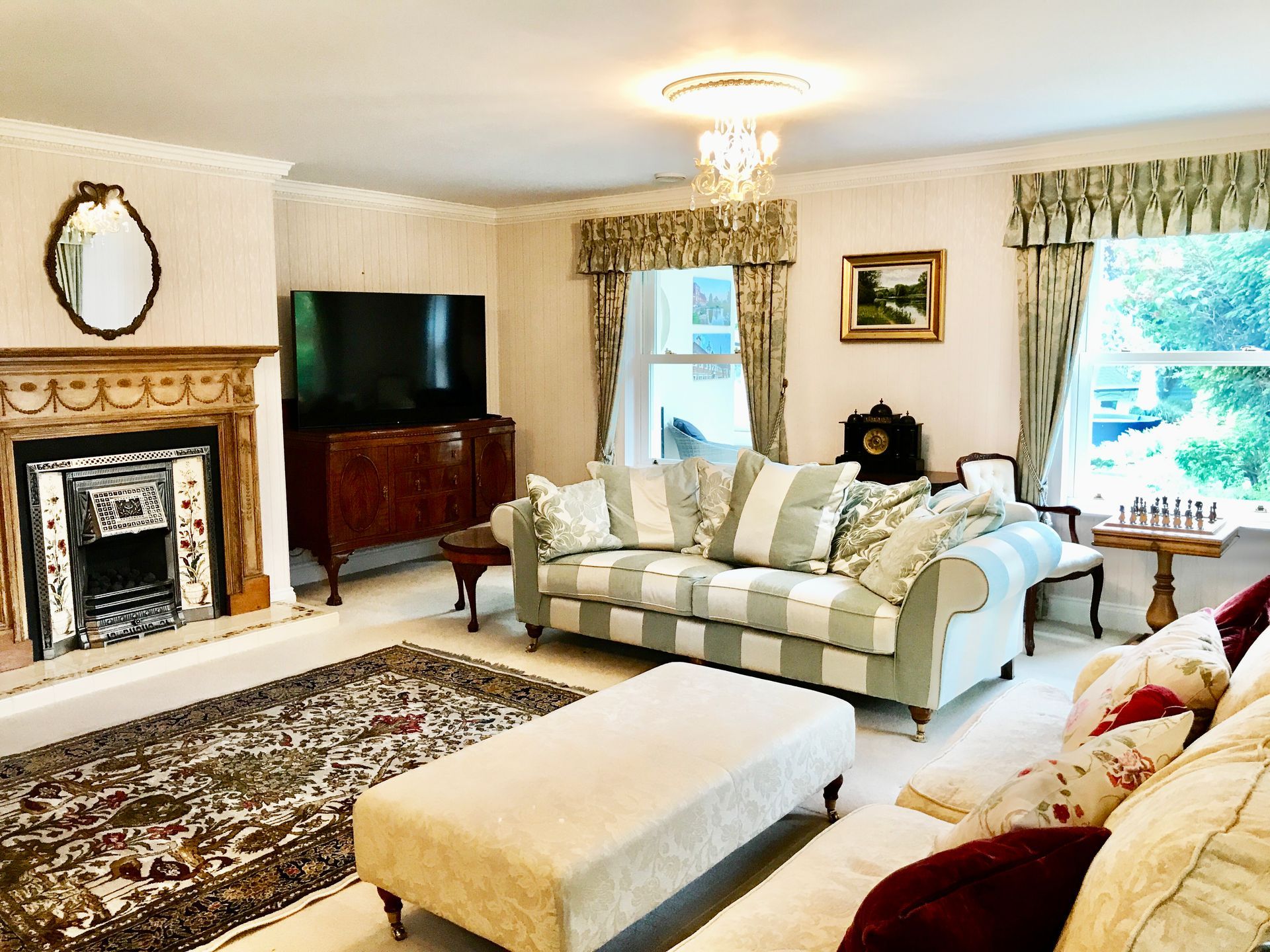 This contemporary home has a spacious bright, airy kitchen and dining area with sun room and wood stove as well as a more formal dining room and a formal drawing room with feature fireplace