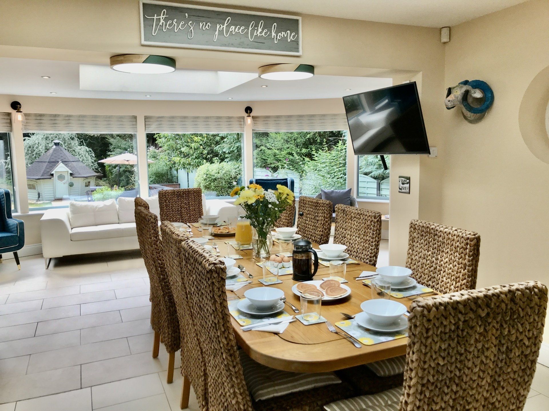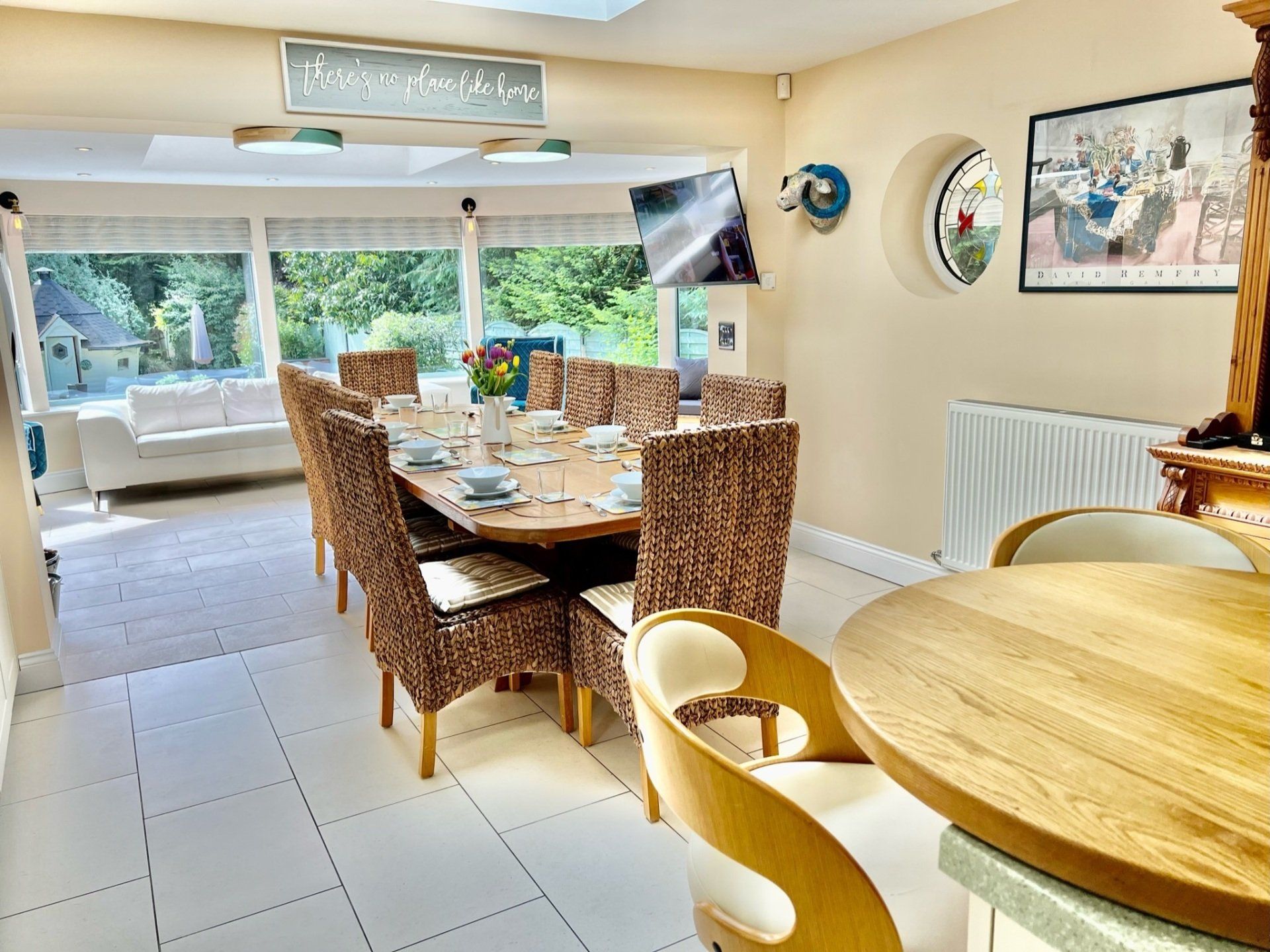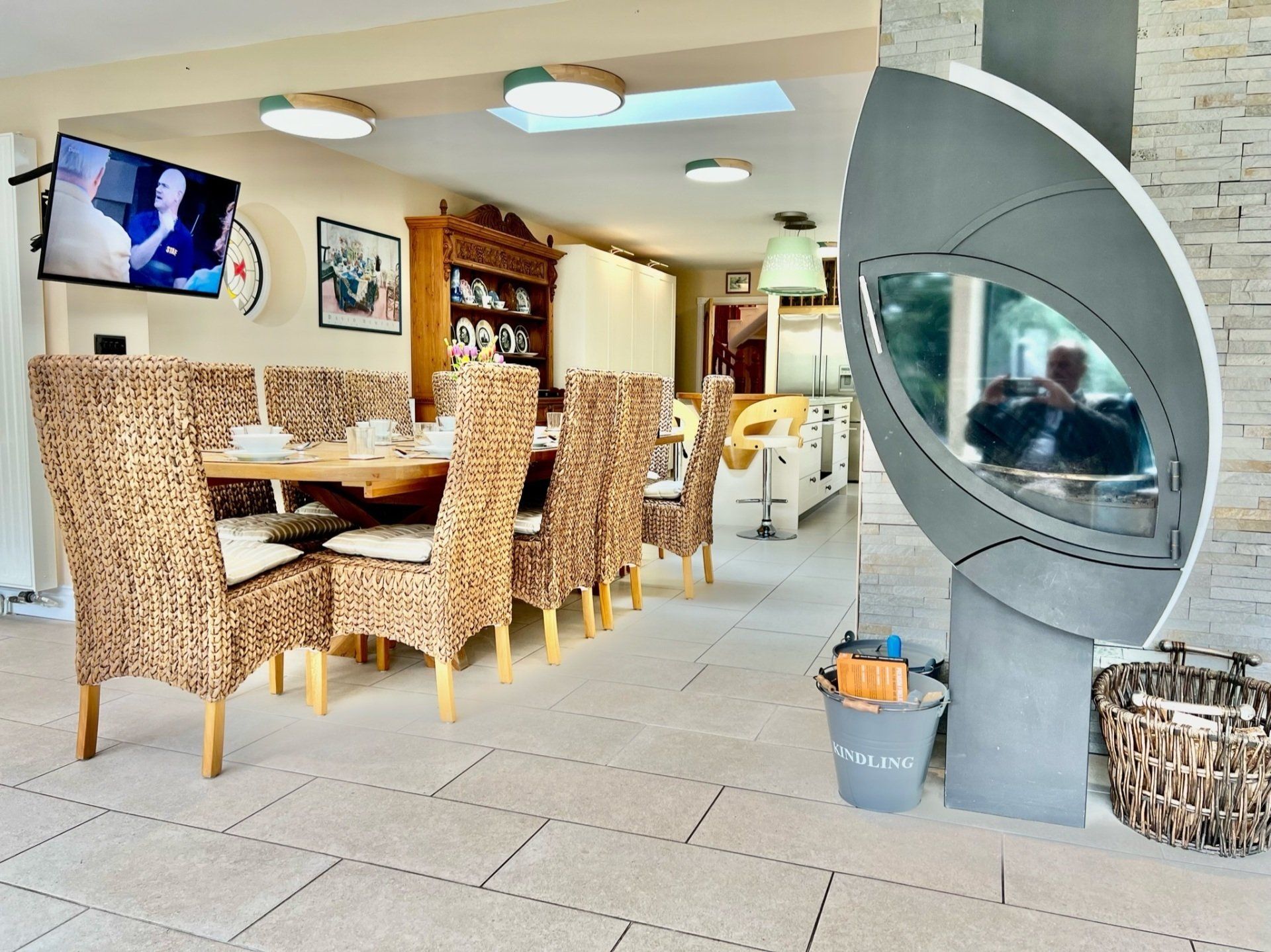 Fully equipped kitchen with dining area, sun room, and wood stove, utility room and patio doors out to the spacious garden.